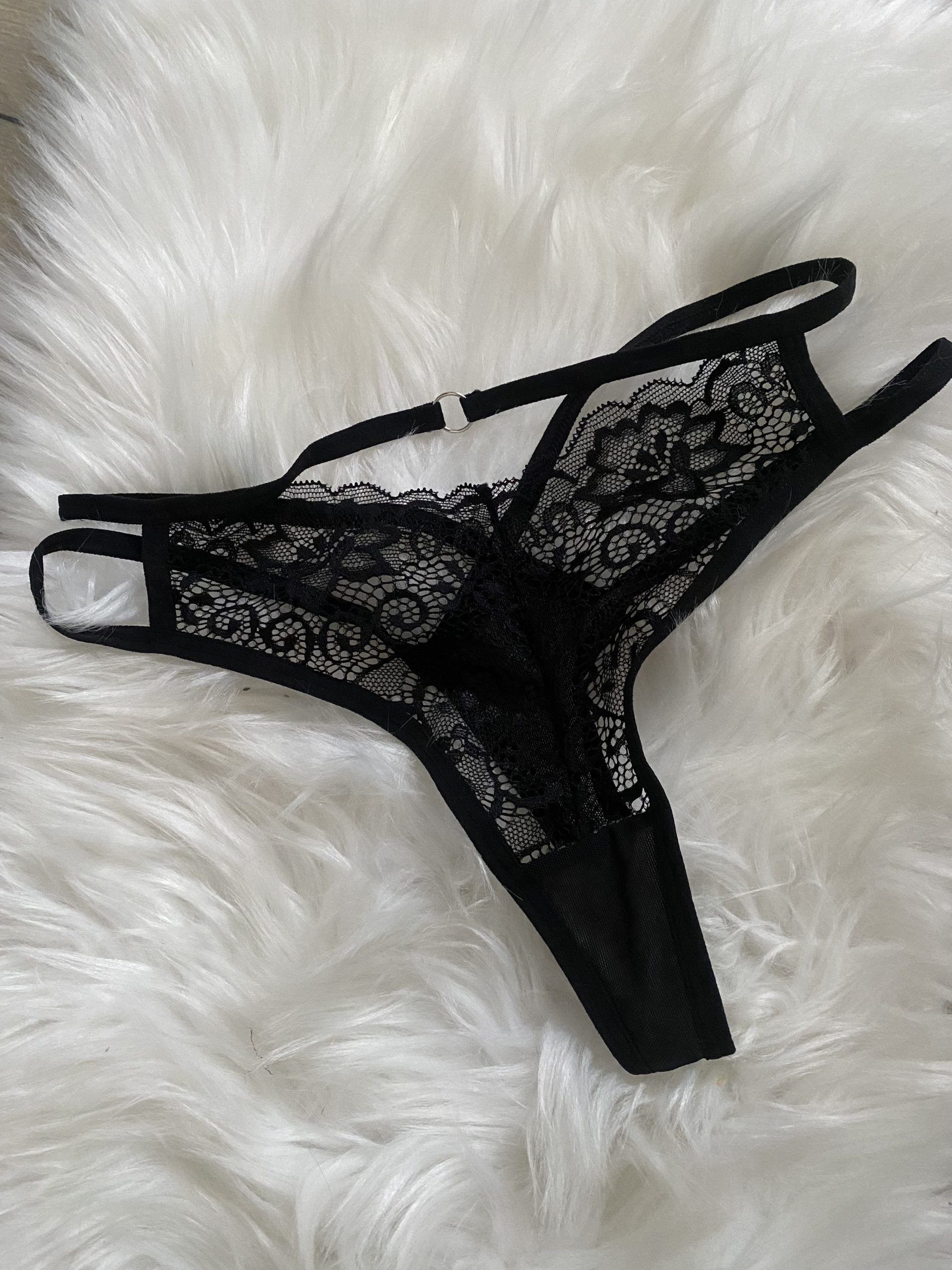 Et par af mine yndlings g-strenge. Strengene omfavner mine hofter. Jeg nyder at kører mine fingre langs blondekanten, lige inden jeg når til mine fugtige læber. Klar til at sprede dem og fylde dem med noget kun til dig -Skal de være dine?